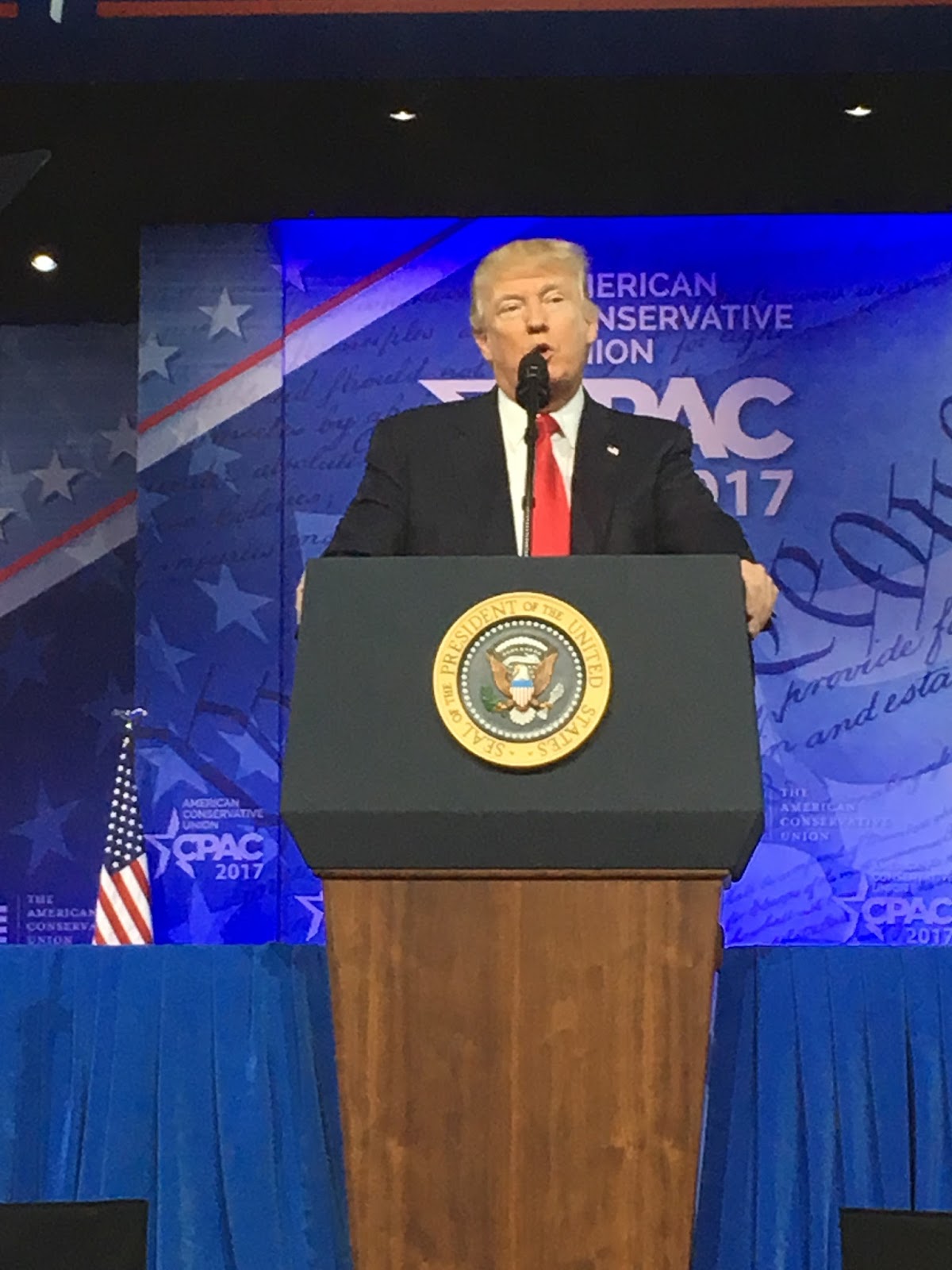 That is the result when you arise for a 10:20 a.m. CPAC speech at 4:40 a.m. Another result is that when, upon arrival at the speaker's podium (at around 0:28), the President of the United States points out to a member of the audience, it is to No Pasarán's webmaster sitting in the front row who'd set up his thumbs in response (it can also be seen at Greta Van Susteren's video, at about 0:35 or on CPAC2017's Recap Video at about 2:06).