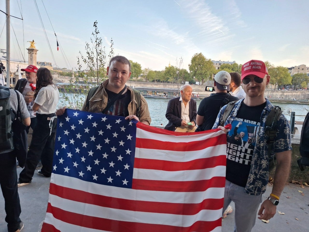 Florian et Laurent, Canadiens, familiers de l’Amérique du Nord ont sorti l’outfit trumpiste pour l’hommage à Kirk. Photo: Lucien Rabouille In the background, far left, sporting a MAGA cap: ROF's Paul Reen |